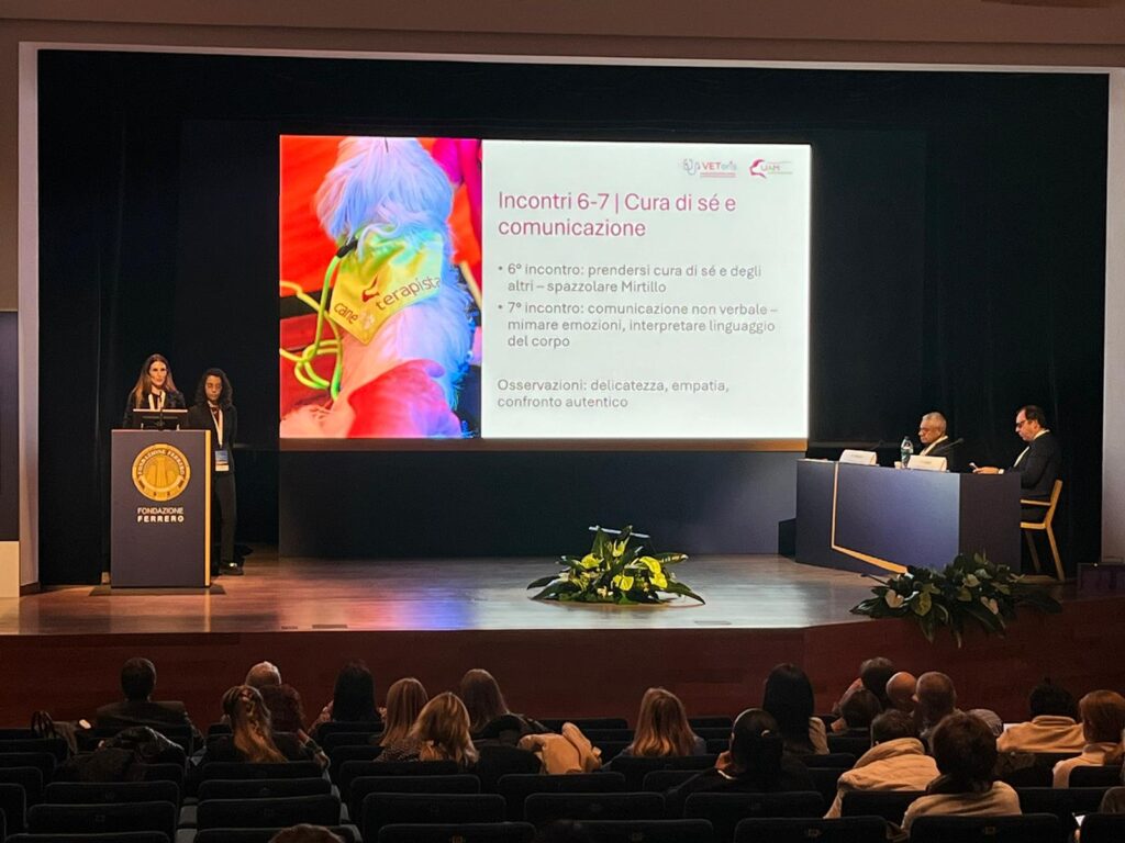 Proprio l’approfondimento di un IAA condotto in Fondazione Ferrero negli scorsi mesi è stato l’argomento della seconda parte del pomeriggio. La dott.ssa Ilaria Ambrosino e la psicologa e psicoterapeuta Miriam Borra, fondatrice di UAM Umanimalmente, hanno presentato i punti principali dello studio pilota portato avanti in Fondazione: in un ciclo di 12 incontri spalmati su 3 mesi, sette Anziane Ferrero hanno avuto a che fare con un cane maltese, Mirtillo, che hanno imparato a conoscere e a cui si sono affezionate.